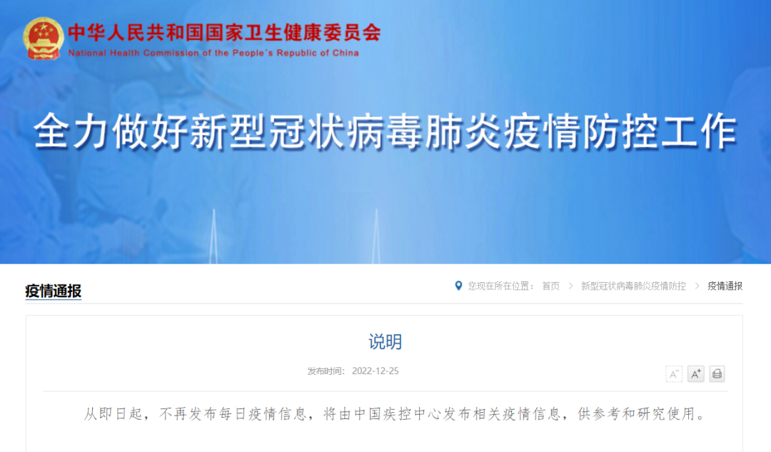 25日,國家衛健委發布說明,從即日起,不再發布每日疫情信息,將由中國疾控中心發布相關疫情信息,供參考和研究使用。