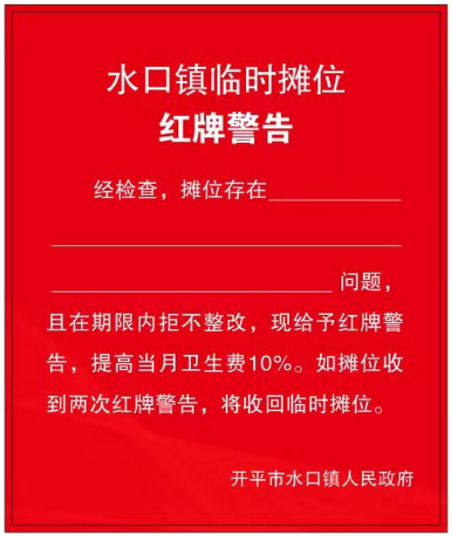 “紅黃牌”警示制度是指水口鎮執法辦加強對臨時攤區(點)市容環境衛生管理情況的監督考核,定期組織檢查,依法對不服從管理、違反市容和環境衛生管理要求的臨時攤檔實行黃牌或紅牌警告。