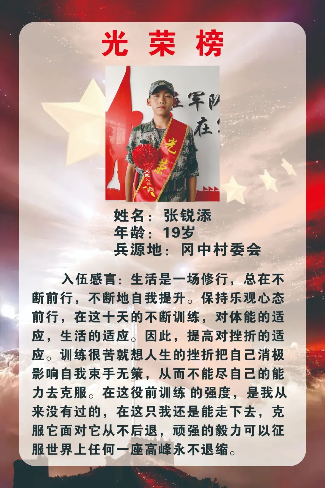 新兵們紛紛表達了投身火熱軍營的熱情和衛(wèi)國戍邊的決心,表示將不負國家和家鄉(xiāng)人民的期望和囑托,主動融入,安心服役,盡快適應(yīng)部隊生活節(jié)奏,刻苦訓練、努力學習,做一名聽黨指揮、能打勝仗、作風優(yōu)良的新時代軍人,為國防事業(yè)作出應(yīng)有貢獻,給家鄉(xiāng)人民交上一份滿意的答卷。