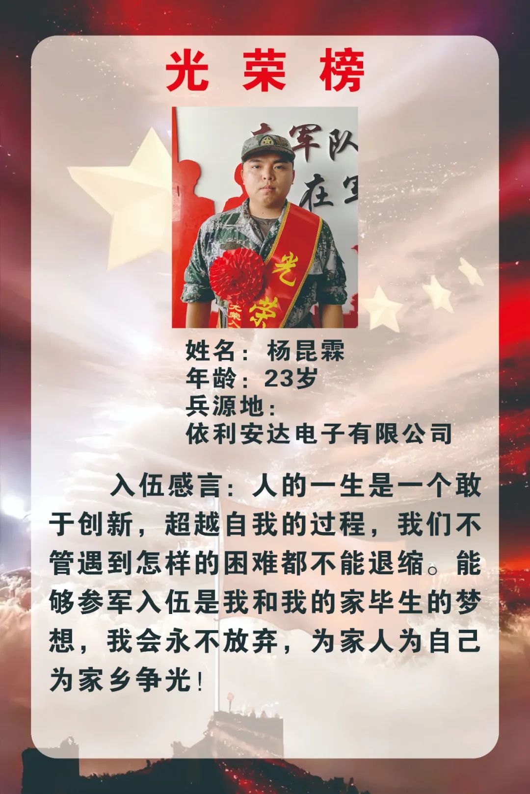 在此輪征兵工作中,開平依利安達電子有限公司廣泛動員滿足條件的青年員工踴躍報名參軍。經(jīng)過層層篩選,最終2名大學生員工懷揣滿腔熱血與豪情奔赴軍營,踏上保家衛(wèi)國新征程。
