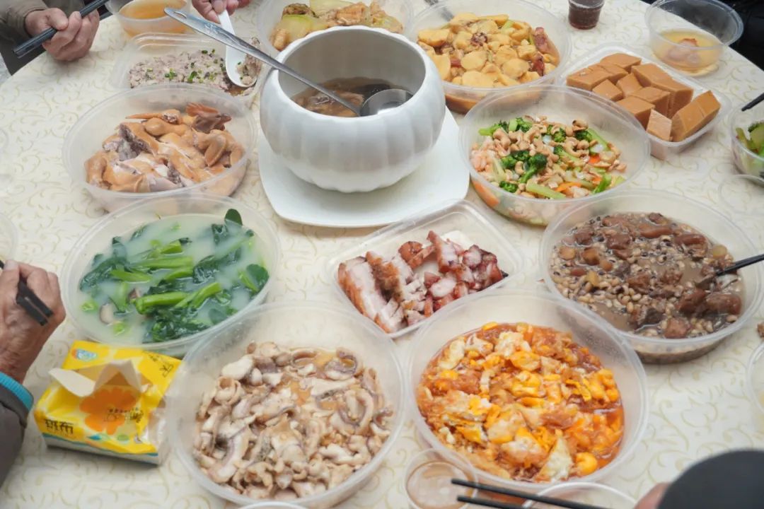 伴隨著互動環節的陣陣歡聲笑語,一道道香氣四溢、熱氣騰騰的菜肴也陸續端上餐桌。為了讓老人們在這頓團年飯中盡享年味,又能滿足他們不同的口味偏好,院工和志愿者們充分考慮了老人們的口味和營養需求,精心準備一場豐盛的年夜飯。白鴿參須湯、白切雞、燒味拼盤、豬手眉豆、香菇肉餅、甜酸蛋等等一道道本地應節年味托起了老人們“舌尖上的幸福”。