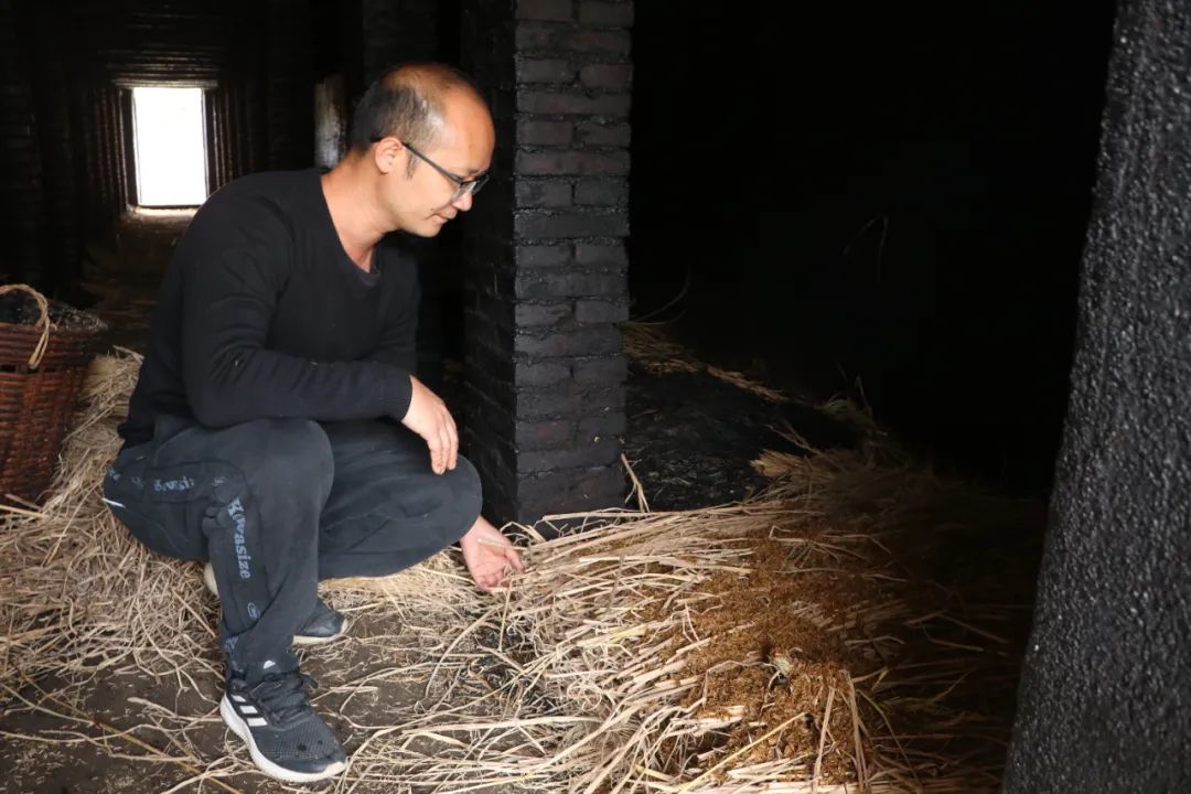 “熏烘火蒜大概需要15天時間。熏房分上下兩層,下層用來點燃禾稈草。我們把干的禾稈草鋪開之后,會在上方再鋪一層濕的谷殼,防止禾稈草燃燒的時候產生明火。燃燒禾稈草的煙熏到二層的蒜,每次大概熏兩個小時,一天熏兩次,熏15天。”