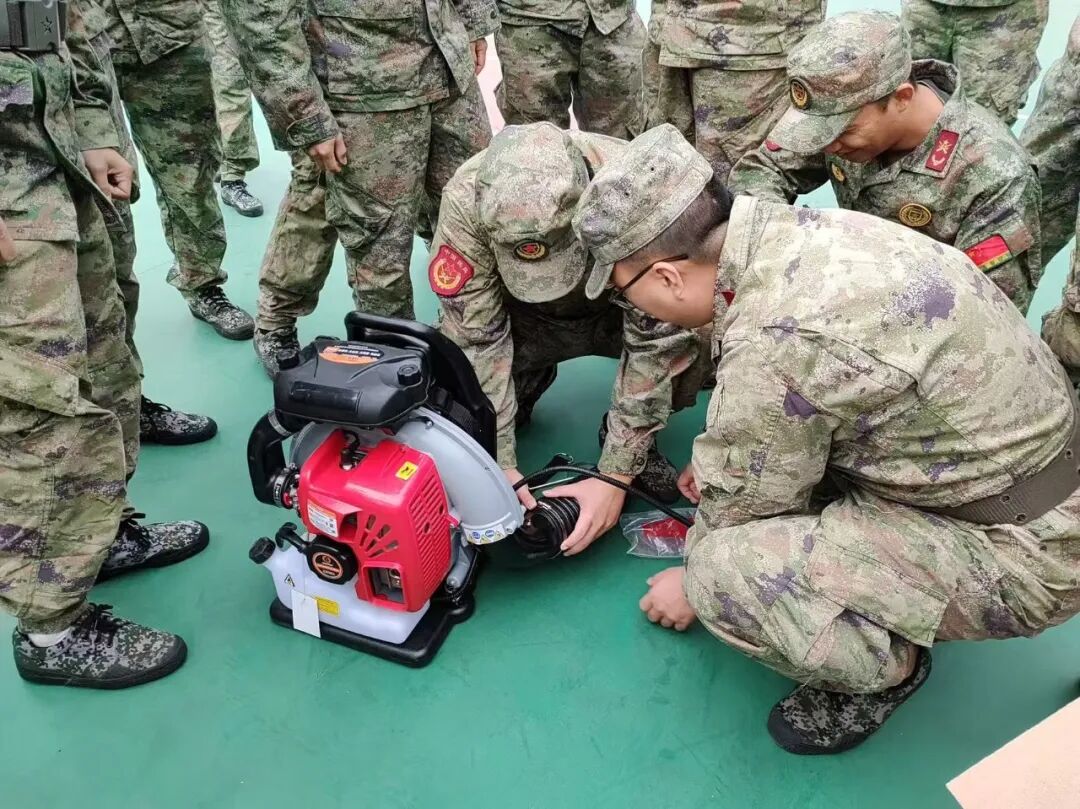 集訓首日,特別邀請了水口鎮專職消防隊前來授課指導,通過理論講解與實操演示相結合的方式,為民兵們帶來了一堂生動的滅火裝備知識課。理論學習結束后,隨即轉入實操訓練環節。在風機操作現場,消防隊員們按照講解步驟,分組進行開機、調試、移動等動作練習,逐一糾正不規范操作,確保每位基干民兵都能熟練掌握操作技巧。滅火把訓練中,民兵們手持滅火把,模擬不同火情場景,練習滅火姿勢和滅火方法,動作標準、配合默契,展現出良好的訓練作風和濃厚的參訓熱情。