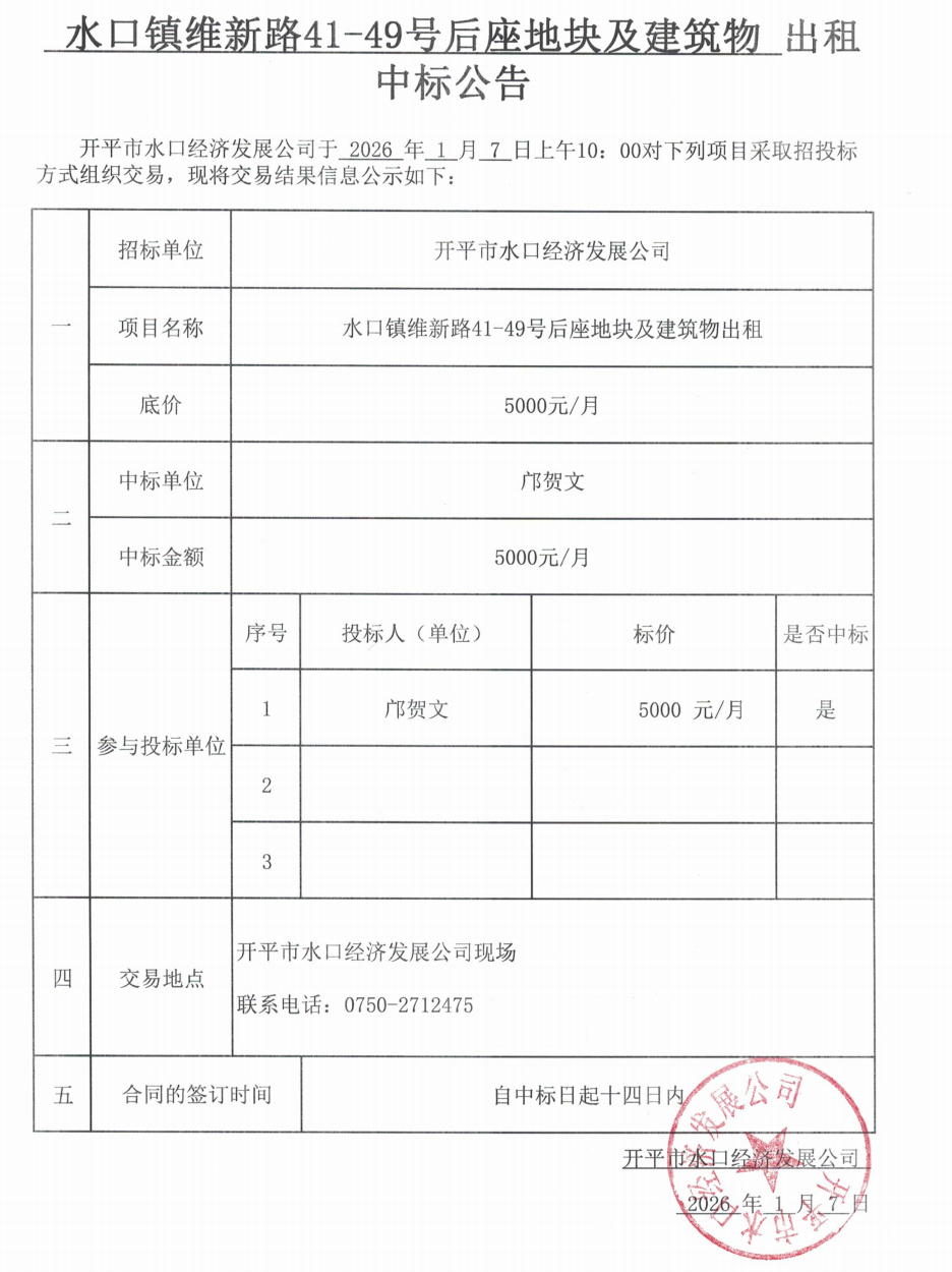 開平市水口經(jīng)濟發(fā)展公司于2026年1月7日上午10時對下列項目采取招投標方式組織交易,現(xiàn)將交易結(jié)果信息公示如下: