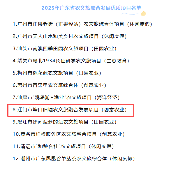 近日 廣東省文化和旅游廳、廣東省自然資源廳、 廣東省農業農村廳公布 2025年農文旅融合發展優質項目名單 其中開平塘口舊墟農文旅融合發展項目在列 自列入首批省整縣推進農文旅融合發展試點以來,開平市以農文旅融合發展產業園為抓手加快建設。采用“管委會+公司”模式,立足深厚僑鄉文化底蘊與扎實農業基礎,整體規劃,統一開發。作為園區四個重要鎮之一,塘口鎮以農文旅融合作為強村富民、風貌提升、鄉村景區化發展的有效途徑,將文化遺產保護與現代農業發展深度融入旅游產業,走出“以農為基、以文為魂、以旅為核”的特色發展之路。 列入試點以來,塘口鎮累計招商超70個,總投資超10億元,助力開平入選文化產業賦能鄉村振興國家級試點,獲評省級文化和旅游特色鎮、省級休閑農業與鄉村旅游示范鎮等稱號,塘口舊墟更入選全國文明鄉風建設十大優秀案例(廣東省唯一)。如今,塘口舊墟這個曾僅有9戶居民、80%建筑閑置的“空心墟”,已實現全方位“蝶變”,2024年接待游客超150萬人次,2025年上半年接待游客超80萬人次。 從“破敗蕭條”成為“宜居宜游” 塘口鎮以“微改造、精提升”煥新舊墟風貌,保留僑鄉騎樓、碉樓特色,修建(含塘口舊墟)的21公里世遺廊道、6.9公里碧道,提升60余間房屋風貌,改造近30畝停車場及休閑廣場,將廢置物業、撂荒空地升級為3A級旅游廁所、綠美小公園,實現“一步一景、處處是畫”。 從“閑置沉睡”實現“增值創收” 創新“產權不變、政府代管、市場化運營”模式,盤活舊糧倉、供銷社等20多處公有閑置建筑,改造為培訓中心、民宿、文創空間等多元場景。另外,通過資產重組形成資金閉環,即將新增兩個千萬級鎮屬優質資產。 從“業態空白”邁向“融合繁榮” 堅持項目為王,撬動社會資本投入,依托世界文化遺產的強大引流效應,引進天下糧倉先鋒書店(華南首店,2024年營業額超500萬元)等精品項目,構建“龍頭帶動、全域發展”的鄉村旅游生態,形成民宿、餐飲、文創、研學等多元業態。片區內現有23家特色民宿與精品酒店,床位超700個,年均入住率超60%,年營收超1500萬元;“塘口優品”農產品行政區品牌年營業額近300萬元,讓農產品向旅游消費端延伸,并依托“塘口家糍館”等載體,讓傳統農耕文化成為可體驗的旅游內容。 從“門可羅雀”變為“人流如織” 致力于構建“原鄉人守根、新鄉人創新、歸鄉人反哺、旅鄉人參與”的共生生態,常住人口從原來的9戶增至2000多人。注重人才回歸,推出“塘口IE公社”人才政策包,通過100元/月人才公寓、最高30%項目補貼等政策,吸引專業人才團隊進駐。通過打造“七夕等墟”“墟里生活節”等品牌活動吸引游客,單個活動吸引超5萬人次游客;以互聯網思維做強流量經濟,借助人民日報海外版“我在中國的72小時”等傳播,全網總閱讀量達2.27億。 未來,塘口鎮將繼續以農文旅融合發展為重要抓手,復制推廣“塘口經驗”,讓農文旅融合成為鄉村增收的“金鑰匙”,助力“百千萬工程”高質量發展,書寫共同富裕的鄉村新篇章。